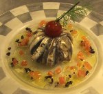 Anchois Marinés- 600 g Anchois- PM gros sel - 1dL huile d'olives - 1dL Banyuls - 1dL Huile d'olive Compotée d'oignons / poivrons- PM d'huile d'olive - 800g poivrons rouges - 300g d'oignons Vinaigrette Banyuls - 1dL huile d'olives - 1dL vinaigre de banyuls Décoration - Dés de tomates - Olives hac...